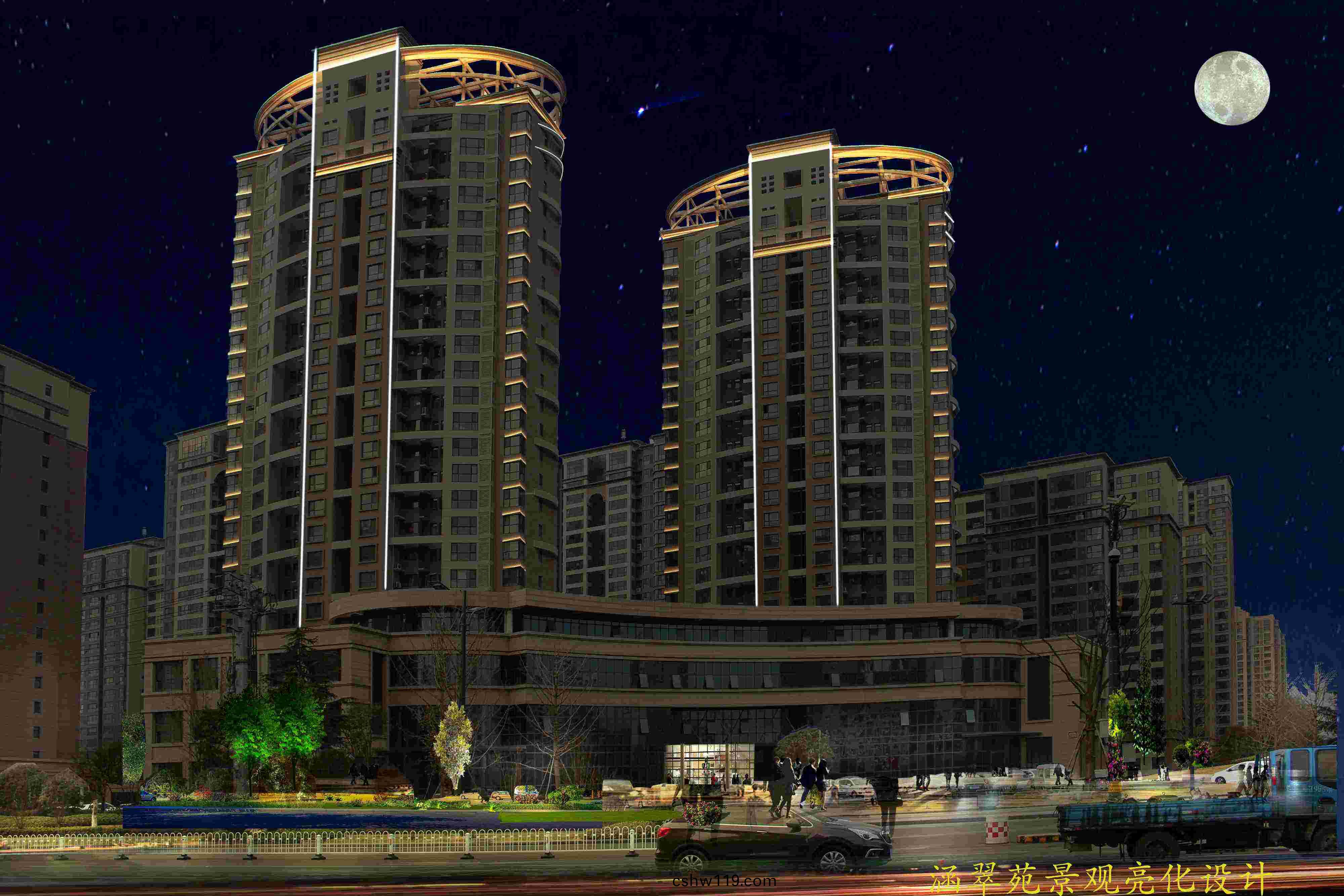 整體風格簡潔、大(da)方,光色上以黃光(guang)爲(wei)主,煗白色爲輔,線條簡潔明(ming)了,突齣建築(zhu)物整體佈跼結構。